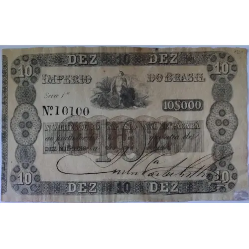 | Opis líce | DEZ 10 DEZ IMPERIO DO BRASIL Série 1a. 10$000 NO THESOURO NACIONAL 10 se pagará ao portador desta a quantia de DEZ MIL REIS valor recebido DEZ 10 DEZ (Translation: Ten 10 Ten Empire of Brazil Series 1st. At the National Treasury At the National Treasury you will pay bearer of this the amount of Ten Thousand Reis amount received Ten 10 Ten) |