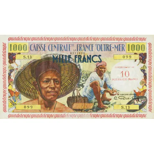 CAISSE CENTRALE DE LA FRANCE D`OUTRE-MER MILLE FRANCS CONTRE-VALEUR DE 10 NOUVEAUX FRANCS Guadeloupe (Translation: Central Fund of Overseas France Thousand Francs Counter-value of Ten New Francs Guadeloupe) |