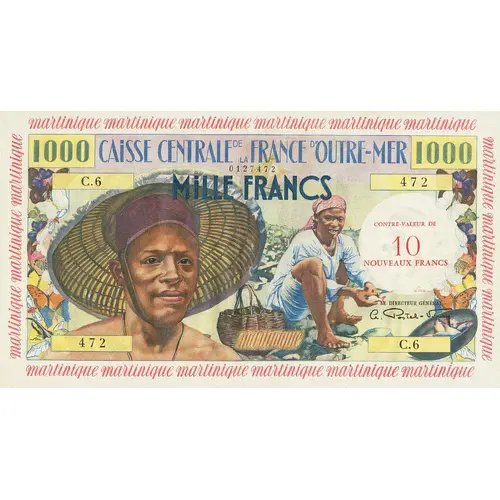 1000 CAISSE CENTRALE DE LA FRANCE D`OUTRE-MER Martinique MILLE FRANCS L`ART 139 DU CODE PÉNAL PUNIT DES TRAVAUX FORCES A PERPÉTUITÉ CEUX QUI AURONT CONTREFAIT OU FALSIFIE LES BILLETS DE BANQUE AUTORISÉES PAR LA LOI (Translation: Central Fund of Overseas France Martinique Thousand Francs Article 139 of the Penal Code punishes with forced labor those who have counterfeited or falsified bank notes authorized by law.) |