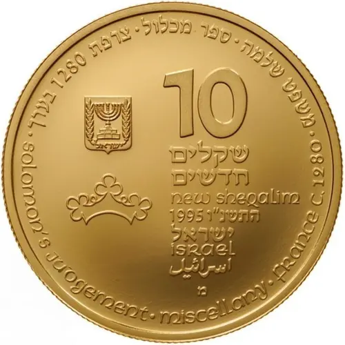 | Obverse description | Face value in Hebrew and English, beneath the face value, the mint year and below, the word `ISRAEL in Hebrew, Arabic and English. Left is the State emblem and beneath it, a decorative element representing a crown, border inscription `Solomon`s judgementmiscellanyFrance c.1280` in English and Hebrew. |