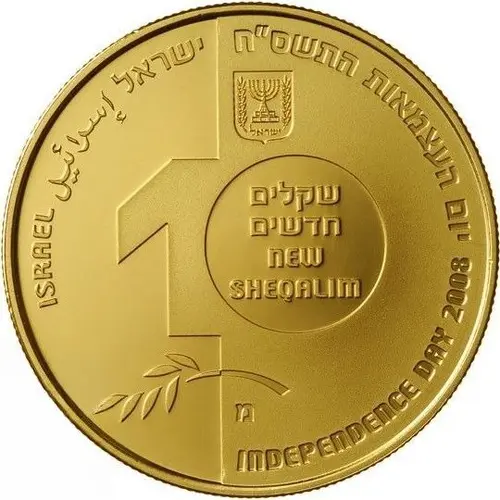 | Obverse description | Face value in Hebrew and English, Israel State Emblem, `Israel` in English, Hebrew and Arabic and an olive branch below the face value; inscription `Independence Day 2008` in Hebrew and English. |
