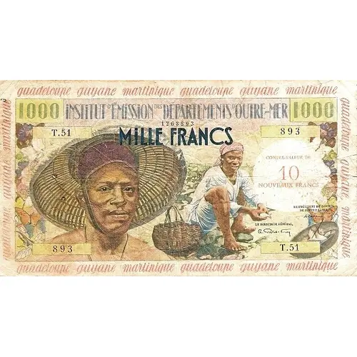 guadeloupe guyane martique guadeloupe guyane martique 1000 / INSTITUT D’ÉMISSION DES DÉPARTEMENTS D`OUTRE-MER / 1000 MILLE FRANCS CONTRE VALEUR DE 10 NOUVEAUX FRANCS guadeloupe guyane martique guadeloupe guyane martique |