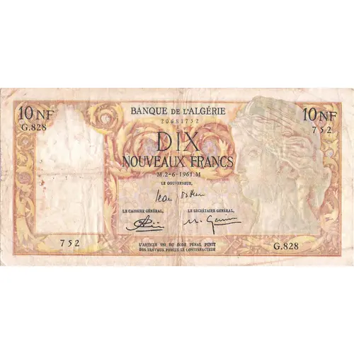 | Obverse lettering | Banque de l`Algérie Dix nouveaux francs 25-11-1960 |