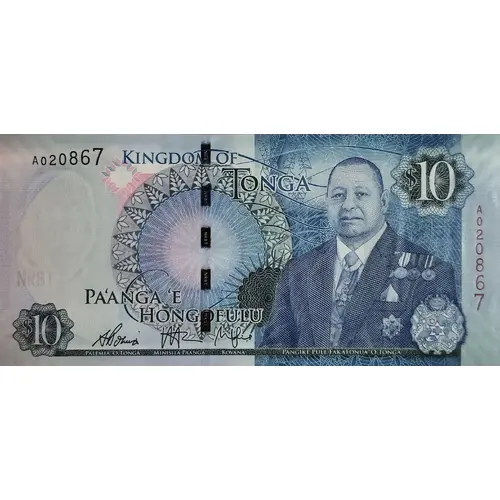KINGDOM OF TONGA 10 PA`ANGA `E HONGOFULU PANGIKE PULE FAKAFONUA `O TONGA (Translation: Kingdom of Tonga Ten Pa`anga National Reserve Bank of Tonga) |