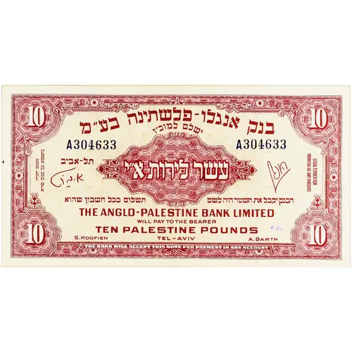 Obverse lettering 10 בנק אנגלו-פלשתינה בע`מ תל-אביב ישלם למוכ`ז עשר לירות א`י הבנק יקבל השטר הזה לשלם תשלום בכל חשבון שהוא THE ANGLO-PALESTINE BANK LIMITED WILL PAY TO THE BEARER TEN PALESTINE POUNDS TEL-AVIV LEGAL TENDER FOR PAYMENT OF ANY AMOUNT מטבע חוקית לתשלום כל סכום שהוא THE BANK WILL ACCEPT THIS NOTE FOR PAYMENT IN ANY ACCOUNT