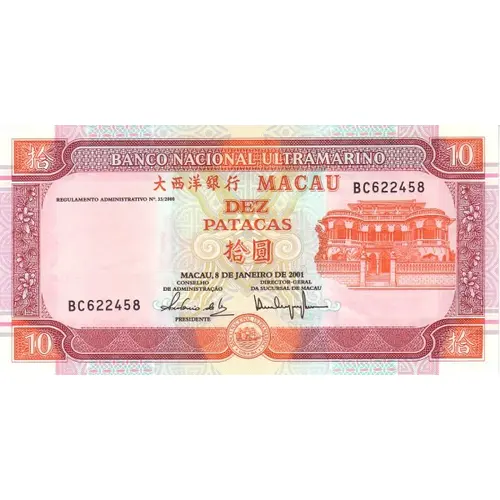 BANCO NACIONAL ULTRAMARINO 大西洋銀行 MACAU REGULAMENTO ADMINISTRATIVO № 33/2000 DEZ PATACAS 拾圓 MACAU, 8 DE JANEIRO DE 2001 CONSELHO DE ADMINISTRAÇÃO / DIRECTOR-GERAL DA SUCURSAL DE MACAU |