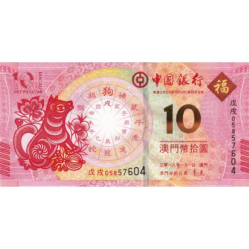 中國銀行 10 MACAU DEZ PATACAS 10 澳門幣拾圓 二零一八年一月一日 澳門 澳門分行總經理 (Translation: Bank of China Ten Macanese Patacas 2018 January 1 Macau Macau Branch General Manager) |