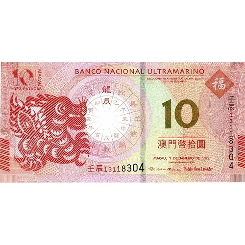 大西洋銀行 10 DEZ PATACAS MACAU 10 澳門幣拾圓 (Translation: Atlantic Bank Ten Patacas Macau Ten Macanese Patacas) |