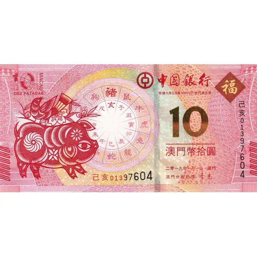 中國銀行 10 MACAU DEZ PATACAS 10 澳門幣拾圓 二零一九年一月一日 澳門 澳門分行總經理 (Translation: Bank of China Ten Macanese Patacas 2019 January 1 Macau Macau Branch General Manager) |