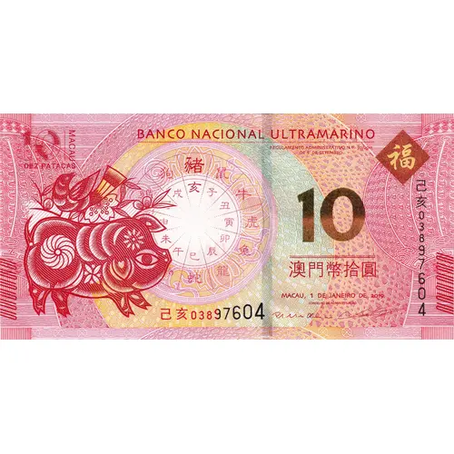 大西洋銀行 10 DEZ PATACAS MACAU 10 澳門幣拾圓 (Translation: Banco Nacional Ultramarino Ten Patacas Macau Ten Macanese Patacas) |