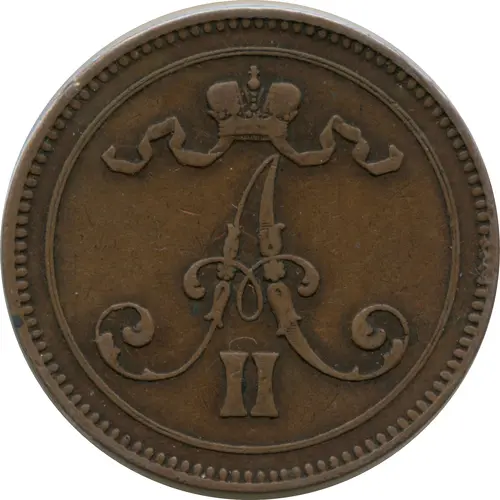 | Reverse lettering | 10 PENNIÄ 1865 |
