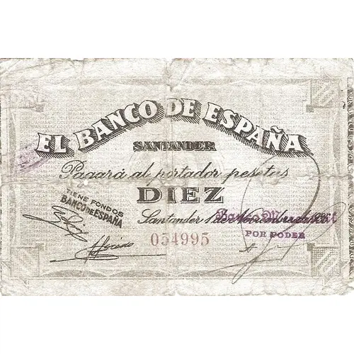 | Obverse lettering | EL BANCO DE ESPAÑA / SANTANDER Pagará al portador pesetas DIEZ Santander 1 de Noviembre de 1936 TIENE FONDOS / BANCO DE ESPAÑA (Translation: The Bank of Spain - Santander Will pay the bearer Pesetas Ten Santander, November 1, 1936 Have funds / Bank of Spain) |