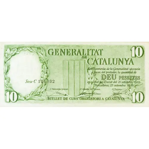 | Opschrift voorzijde | 10 GENERALITAT DE CATALUNYA La tresoreria de la Generalitat reconeix a favor del portador la quantitat de DEU PESSETES en virtut del Decret del 21 setembre 1936 Barcelona, 25 setembre 1936 BITLLET DE CURS OBLIGATORI A CATALUNYA (Translation: Generalitat de Catalunya The Treasury of the Generalitat recognizes in favor of the bearer the amount of Ten Pesetas by virtue of the Decree of September 21, 1936 Barcelona, September 25, 1936 Mandatory course banknote in Catalonia) |