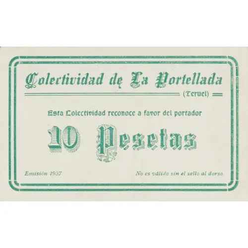 | Obverse lettering | Colectividad de La Portellada (Teruel) Esta Colectividad reconoce a favor del portador 10 Pesetas Emisión 1937 No es válido sin el sello al dorso (Translation: Collectivity of La Portellada (Teruel) This Collectivity recognizes in favor of the bearer 10 Pesetas Issue 1937 Not valid without the stamp on the back) |