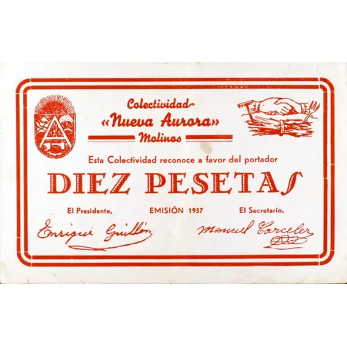 Colectividad `Nueva Aurora` Molinos Esta Colectividad reconoce a favor del portador DIEZ PESETAS EMISIÓN 1937 (Translation: Collectivity `Nueva Aurora` Molinos This Collectivity recognizes in favor of the bearer Ten Pesetas Issue 1937) |