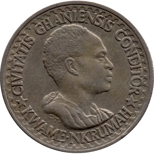 Technical/Grading: Struck in copper-nickel (75% Copper, 25% Nickel), weighing 3.25 grams and 20 mm, the 10 Pesewas generally displays good strike quality. Key high-points for grading on the obverse include Nkrumah's hair, cheekbone, and collar. On the reverse, attention should focus on the cacao pod's texture and the crispness of the lettering. Strong strikes yield full definition, though circulating examples often show wear on high-points and common bag marks in the fields.