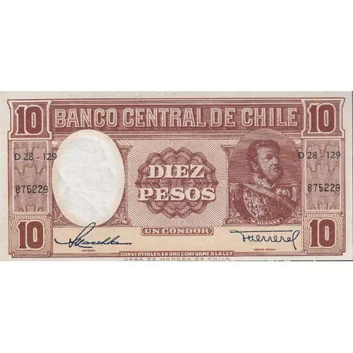 | Obverse lettering | BANCO CENTRAL DE CHILE DIEZ PESOS UN CONDOR CONVERTIBLES EN ORO CONFORME A LA LEY CASA DE MONEDA DE CHILE (Translation: Central Bank of Chile Five Pesos One Condor Convertible on gold, according to the Law. Chile Mint) |