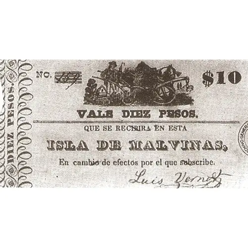 | Obverse lettering | VALE DIEZ PESOS QUE SE RECIBIRA EN ESTA ISLA DE MALVINAS, En cambio de efectos por el que subscribe. |