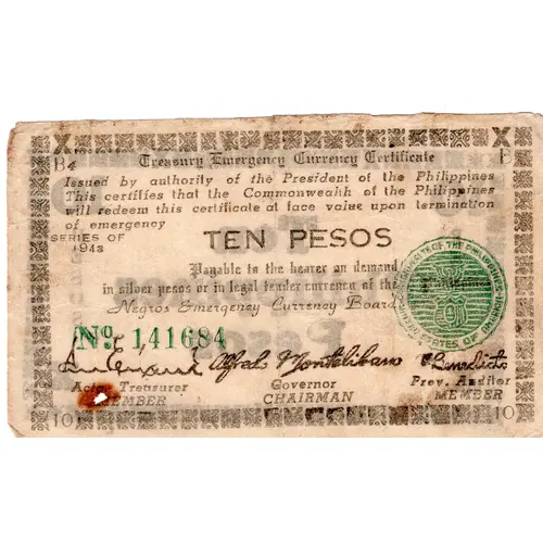 | Obverse lettering | TREASURY EMERGENCY CURRENCY CERTIFICATE ISSUED BY AUTHORITY OF THE PRESIDENT OF THE PHILIPPINES THIS CERTIFIES THAT THE COMMONWEALTH OF THE PHILIPPINES WILL REDEEM THIS CERTIFICATE AT FACE VALUE UPON TERMINATION OF EMERGENCY ONE PESO PAYABLE TO THE BEARER ON DEMAND IN SILVER PESOS OR IN LEGAL TENDER CURRENCY OF THE PHILIPPINES NEGROS EMERGENCY CURRENCY BOARD |