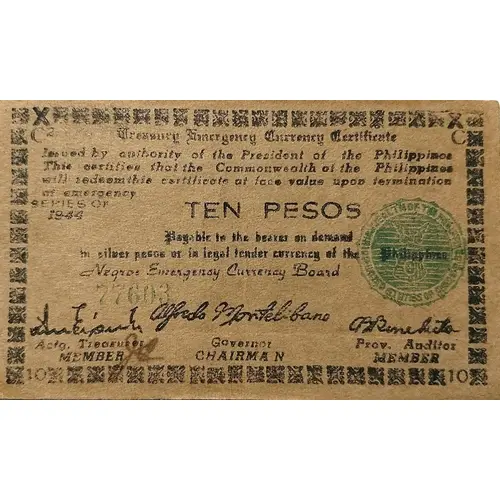 | 正面铭文 | TREASURY EMERGENCY CURRENCY CERTIFICATE ISSUED BY AUTHORITY OF THE PRESIDENT OF THE PHILIPPINES THIS CERTIFIES THAT THE COMMONWEALTH OF THE PHILIPPINES WILL REDEEM THIS CERTIFICATE AT FACE VALUE UPON TERMINATION OF EMERGENCY TEN PESOS PAYABLE TO THE BEARER ON DEMAND IN SILVER PESOS OR IN LEGAL TENDER CURRENCY OF THE PHILIPPINES NEGROS EMERGENCY CURRENCY BOARD |