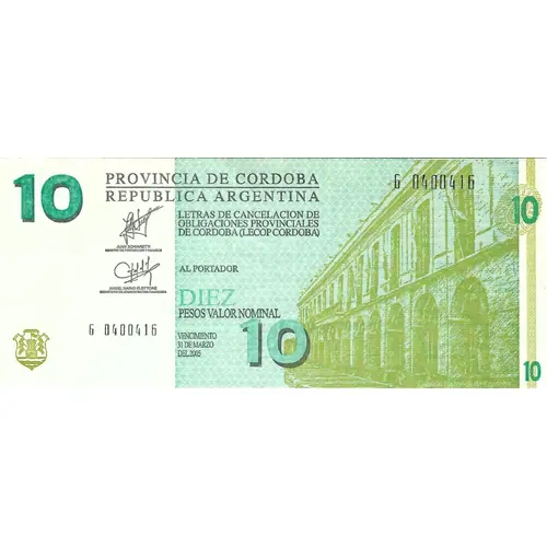 PROVINCIA DE CORDOBA REPUBLICA ARGENTINA LETRAS DE CANCELACIONES DE OBLIGACIONES PROVINCIALES DE CORDOBA (LECOP CORDOBA) AL PORTADOR DIEZ PESOS VALOR NOMINAL VENCIMIENTO 31 DE MARZO DE 2005 (Translation: PROVINCE OF CORDOBA ARGENTINIAN REPUBLIC LETTERS OF CANCELLATIONS OF PROVINCIAL OBLIGATIONS FROM CORDOBA (LECOP CORDOBA) TO THE CARRIER TEN NOMINAL VALUE PESOS EXPIRATION 31 MARCH FROM 2005) |