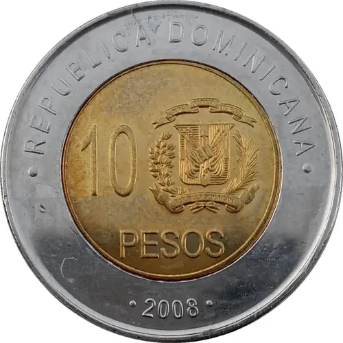 | Legenda do anverso | REPUBLICA DOMINICANA 10 PESOS 2008 (Translation: Dominican Republic 10 Pesos 2016) |