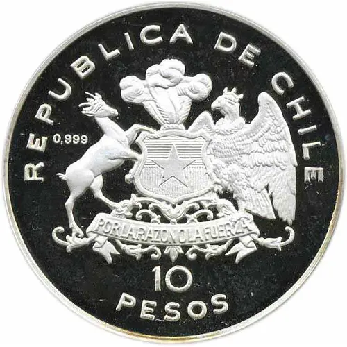 | Obverse lettering | REPUBLICA DE CHILE 0,999 PORLARAZONOLAFUERZA 10 PESOS (Translation: Republic of Chile 10 Pesos) |