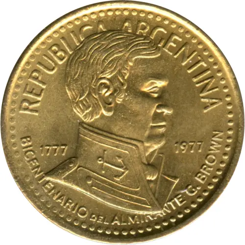 | Obverse lettering | REPUBLICA ARGENTINA 1777 1977 BICENTENARIO DEL ALMIRANTE G. BROWN (Translation: Republic of Argentina 1777 1977 Bicentennial of Admiral G. Brown) |
