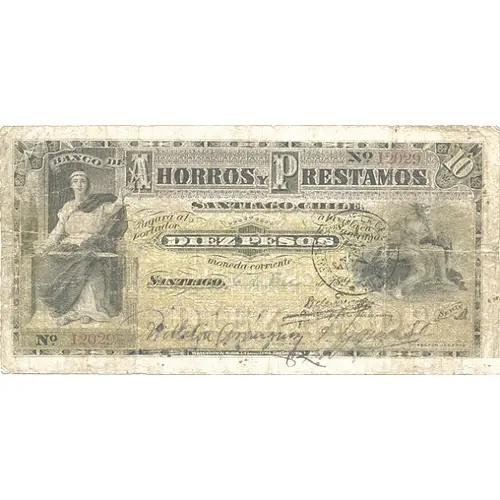 | Obverse lettering | BANCO DE AHORROS Y PRÉSTAMOS SANTIAGO, CHILE Pagará al portador á la vista DIEZ PESOS moneda corriente. SANTIAGO, 6 de Febrero de 1893. (Translation: Savings and Loan Bank Santiago, Chile Will pay to bearer at sigh Ten Pesos in currency Santiago, February 6, 1893.) |