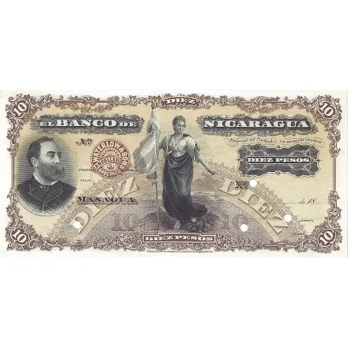 | Obverse lettering | EL BANCO DE NICARAGUA Pagará al portador en moneda efectiva DIEZ PESOS MANAGUA Waterlow & Sons Ltd. Londres, Inglaterra (Translation: The Bank of Nicaragua Will pay the bearer in effective currency Ten Pesos Managua Waterlow & Sons Ltd. London, England) |