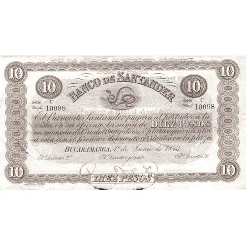 | Obverse lettering | 10 Banco De Santander 10 El Banco de Santander pagará al portador á la vista en su oficina, la suma de DIEZ PESOS en moneda de Oro de 0,900, ó de oro ó plata equivalentes á esta, con el premio ó descuento corriente en la plaza Bucaramanga, 1º de Junio de 1873 DIEZ PESOS (Translation: 10 Bank of Santander 10 The Bank of Santander will pay to the bearer at sight at their office, the amount of ten Pesos in 0.999 gold currency, or equivalent gold or silver to this, with the add or discount current on the location. Bucaramaga, June 1st., 1873 Ten Pesos) |