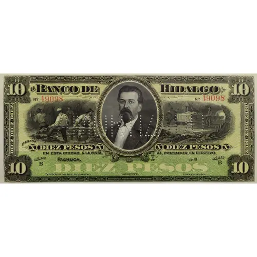 | Obverse lettering | El Banco de Hidalgo pagará diez pesos en esta ciudad, a la vista, al portador, en efectivo. (Translation: The Banco of Hidalgo will pay ten pesos in this city, on demand, to bearer, in cash.) |