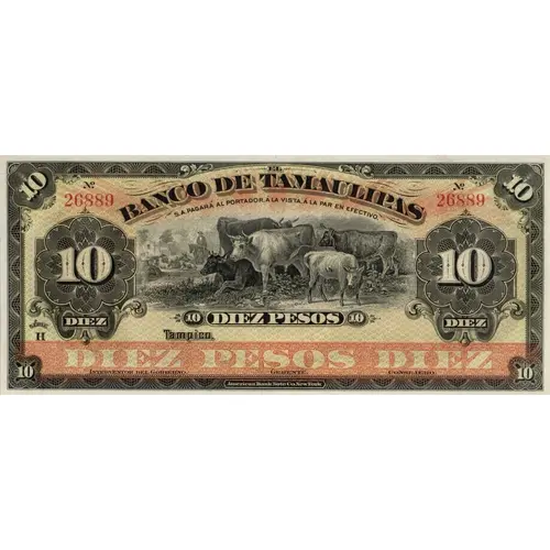| Obverse lettering | 10 diez El Banco de Tamaulipas diez 10 pagara al portador a la vista, a la par en efectivo Diez Pesos Interventor del Gobierno Gerente Consejero |