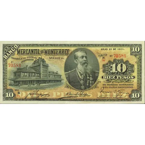 | Obverse lettering | El Banco Mercantil de Monterrey México, Pagará á la vista al portador Diez Pesos en moneda corriente del cuño Mexicano. (Translation: The Merchant Bank of Monterrey Mexico, will pay to the bearer Ten Pesos in current Mexican coin.) |