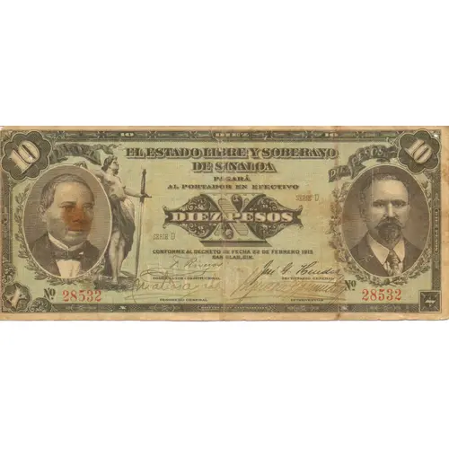 EL ESTADO LIBRE Y SOBERANO DE SINALOA PAGARÁ EL PORTADOR EN EFECTIVO DIEZ PESOS CONFORME AL DECRETO FECHA 22 DE FEBRERO 1914 SAN BLAS, SIN. (Translation: The Free and Sovereign State of Sinaloa will pay the bearer in cash Ten Pesos conforming to the decree dated 22 February 1914. San Blas, Sinaloa) |