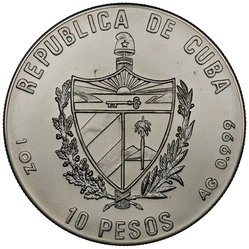| Obverse lettering | REPUBLICA DE CUBA 1 OZ. 10 PESOS AG 0.999 (Translation: Republic of Cuba 1 ounce 10 Pesos silver 0.999) |
