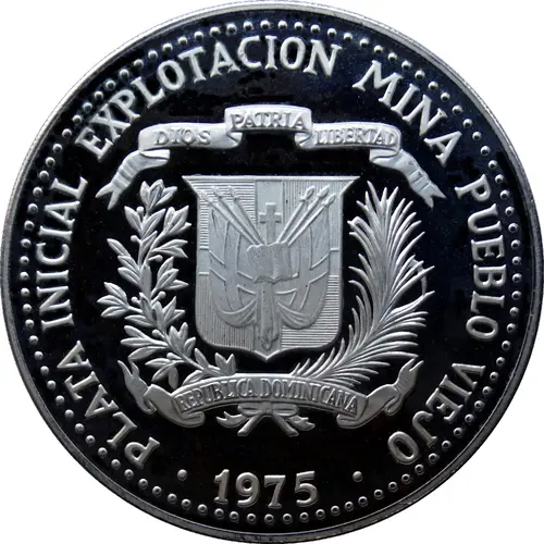 | Obverse lettering | PLATA INICIAL EXPLOTACION MINA PUEBLO VIEJO DIOS PATRIA LIBERTAD REPUBLICA DOMINICANA 1975 (Translation: Initial Silver Pueblo Viejo Mine Exploitation God, Homeland, Freedom Dominican Republic) |