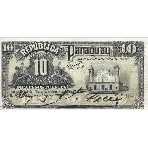 | Obverse lettering | REPÚBLICA DEL Paraguay LA NACION RECONOCE ESTE BILLETE POR 10 DIEZ PESOS FUERTES que pagará conforme á la ley de 18 de Noviembre de 1899. (Translation: Republic of Paraguay The Nation recognizes this note for Ten Pesos Fuertes That will pay according to the Law of November 18th., 1899.) |