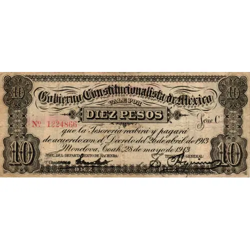 | Obverse lettering | GOBIERNO CONSTITUCIONALISTA DE MÉXICO VALEPOR DIEZ PESO Serie C |