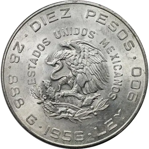 | Obverse lettering | · DIEZ PESOS · ESTADOS UNIDOS MEXICANOS 28.888 G · 1956 · LEY 900 (Translation: Ten Pesos United Mexican States 28.888 Grams · 1956 · Silver 900) |