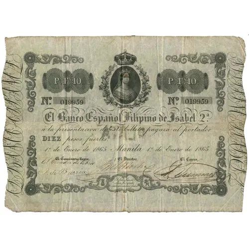 EL BANCO ESPAÑOL FILIPINO DE ISABEL 2a á la presentacion de este billete pagará al portador DIEZ PESOS FUERTE MANILA (Translation: The Spanish-Filipino Bank of Isabel II Upon presentation of this bill, will pay the bearer Ten hundred hard pesos) |