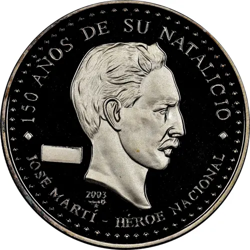 | Obverse lettering | 150 AÑOS DE SU NATALICIO 2003 ⁕ JOSE MARTI - HÉROE NACIONAL ⁕ (Translation: 150 anniversary of his birthday 2003 José Martí, National Hero) |