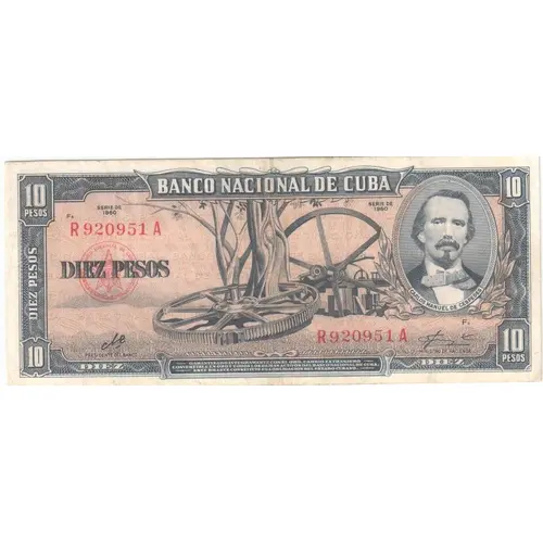 | Obverse lettering | 10 PESOS 10 BANCO NACIONAL DE CUBA DIEZ PESOS CARLOS MANUEL DE CESPEDES GARANTIZADO INTEGRAMENTE CON EL ORO, CAMBIO EXTRANJERO CONVERTIBLE EN ORO Y TODOS LOS DEMÁS ACTIVOS DEL BANCO NACIONAL DE CUBA. ESTE BILLETE CONSTITUYE UNA OBLIGACIÓN DEL ESTADO CUBANO. (Translation: 10 Pesos 10 National Bank of Cuba Ten Pesos Carlos Manuel de Céspedes Fully Guaranteed with the gold, foreign exchange. Convertible into gold and all the other assets of the National Bank of Cuba This note constitutes an obligation of the Cuban State.) |