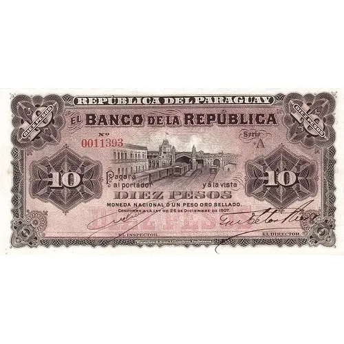| Obverse lettering | REPÚBLICA DEL PARAGUAY EL BANCO DE LA REPÚBLICA Pagará al portador y á la vista DIEZ PESOS MONEDA NACIONAL Ó UN PESO ORO SELLADO Conforme a la Ley de 26 de Diciembre de 1907. (Translation: Republic of Paraguay The Bank of the Republic Will pay to the bearer and at sight Ten Pesos National currency or One Peso Sealed Gold Accordingly to Law from December 26th., 1907.) |