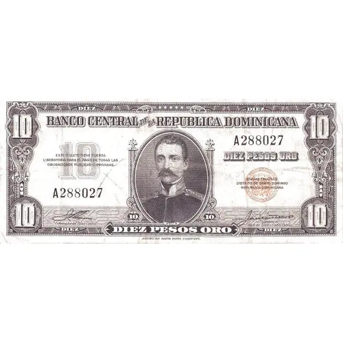 | Vorderseitenlegende | Banco Central de la República Dominicana Ciudad Trujillo - Distrito de Santo Domingo Diez Pesos Oro 10 Diez Pesos Oro 10 American Bank Note Company |