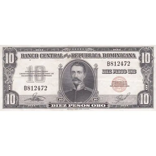 | Ön yüz lejandı | Banco Central de la República Dominicana 10 Diez Pesos Oro Ciudad Trujillo - Distrito Nacional 10 Diez Pesos Oro 10 American Bank Note Company |