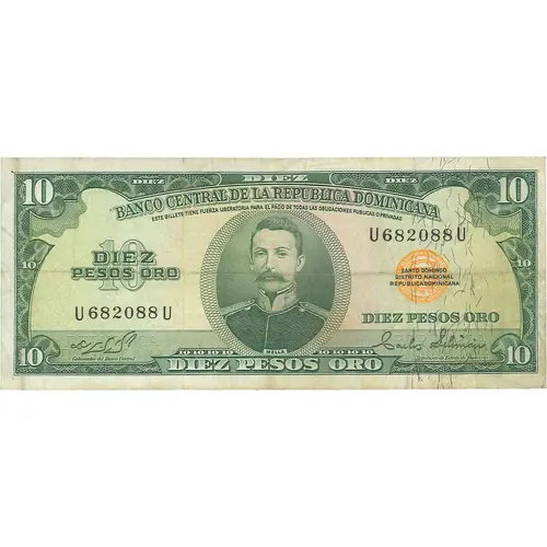 | Obverse lettering | 10 BANCO CENTRAL DE LA REPUBLICA DOMINICANA 10 ESTE BILLETE TIENEN FUERZA LIBERATORIA PARA EL PAGO DE TODAS LAS OBLIGACIONES PUBLICAS O PRIVADAS 10 DIEZ PESOS ORO SANTO DOMINGO DISTRITO NACIONAL REPUBLICA DOMINICANA DIEZ PESOS ORO MELLA 10 DIEZ PESOS ORO 10 (Translation: 10 Central Bank of the Dominican Republic 10 Ten Pesos Oro This note has liberatory force for payment of al debts public or private Santo Domingo National District Dominican Republic 10 Mella 10 Ten Pesos Oro) |