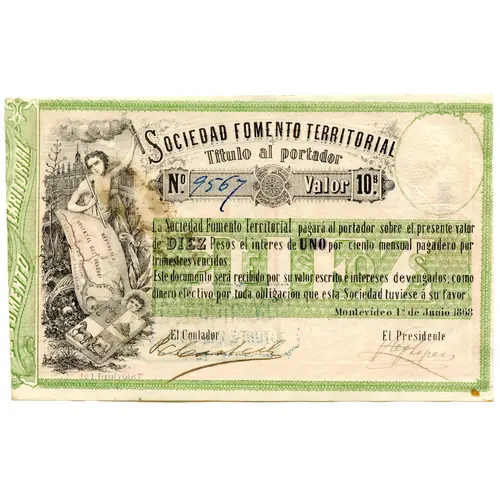 | Obverse lettering | Sociedad fomento territorial Titulo al portador Nº ____ Valor 10$ La Sociedad Fomento Territorial pagará al portador sobre el presente valor de DIEZ Pesos el interés de UNO por ciento mensual pagadero por trimestres vencidos. Este documento será recibido por su valor escrito é intereses devengados como dinero efectivo por toda obligación que esta Sociedad tuviese á su favor. A. Hequet y Cohas (Translation: Territorial Promotion Society Bearer bond. #____ Value $ 10 The Territorial Promotion Society will pay to the bearer over this value of ten Pesos, interest of one per cent monthly, payable each overdue quarter. This document will be accepted for its face value plus interests overdue as cash money for every obligation that this Society should have on their favor. A. Hequet & Cohas) |