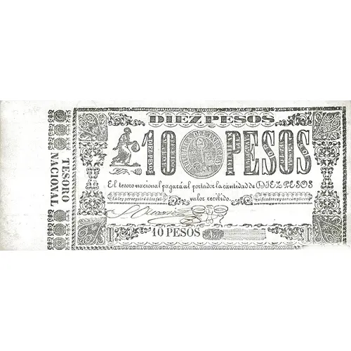 | Vorderseitenlegende | DIEZ PESOS REPÚBLICA DEL PARAGUAY 10 PESOS El Tesoro Nacional pagará al portador la cantidad de DIEZ PESOS valor recibido. La Ley perseguirá á los falsificadores y sus cómplices. 10 PESOS (Translation: Ten Pesos Republic of Paraguay The National Treasury will pay to the bearer the amount of Ten Pesos received value. The law will prosecute counterfeiters and their accomplices. 10 Pesos) |