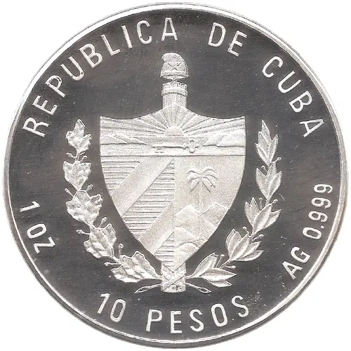 | Obverse lettering | REPUBLICA DE CUBA 1 OZ 10 PESOS AG 0.999 (Translation: Republic of Cuba 1 ounce 10 Pesos silver 0.999) |